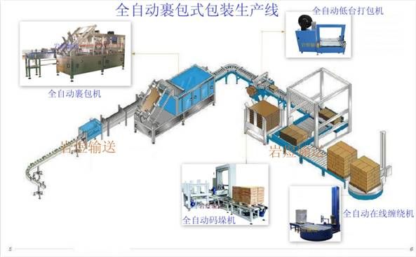 生產(chǎn)流程: 自動紙箱成型--自動裝箱--自動(噴膠)封箱--自動打包--自動碼垛--自動纏繞